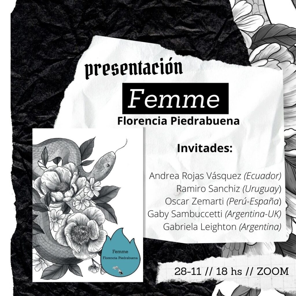 El domingo es la presentación de “Femme” de Florencia Piedrabuena. La cita será por Zoom el domingo 28 de noviembre a las 18 hs. (Argentina). Este evento que contará con invitades especiales y el apoyo de La Ninfa Eco.